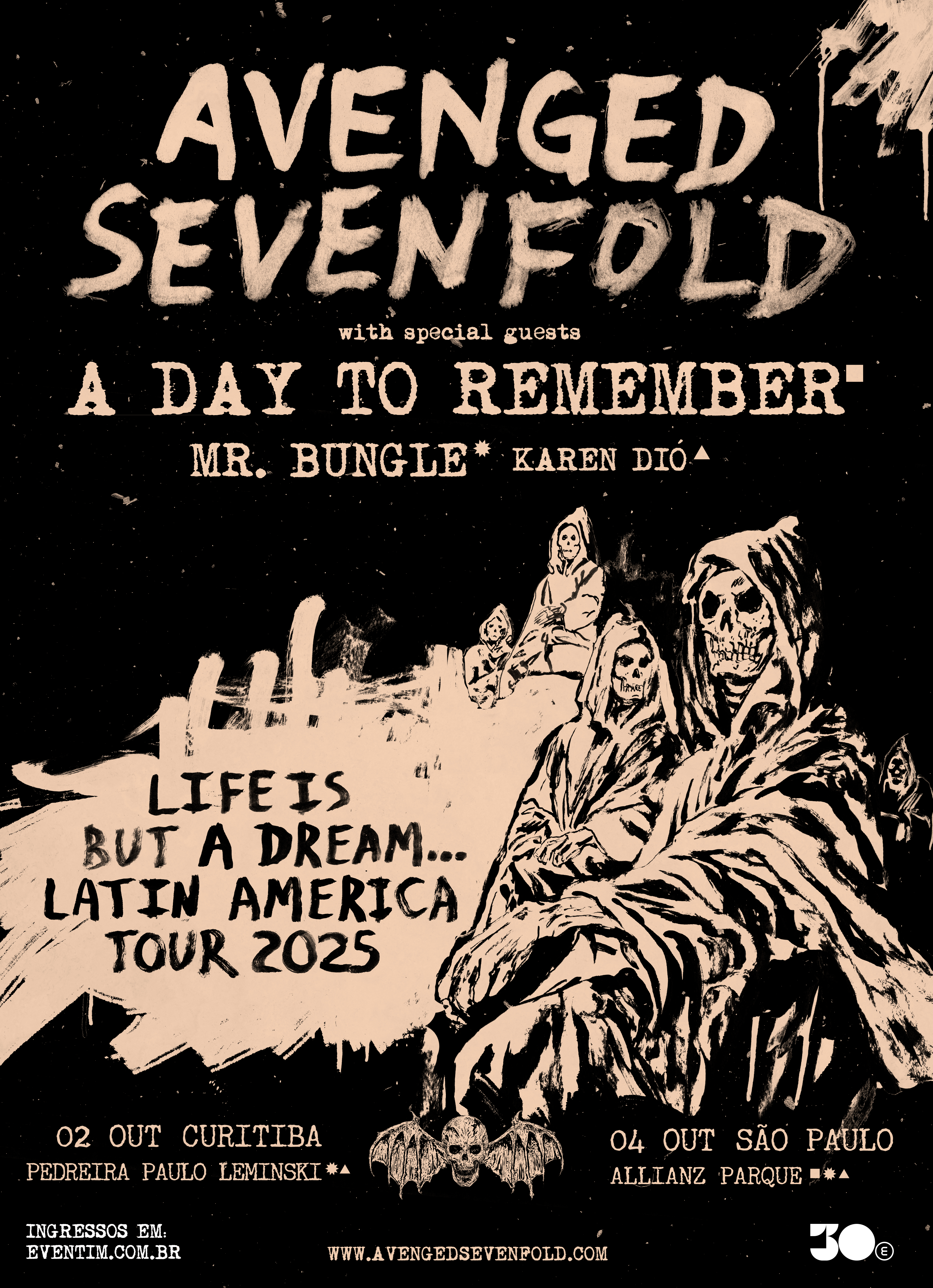 Os fãs brasileiros do Avenged Sevenfold podem comemorar: após 11 anos, a banda californiana retorna ao país com a sua aguardada turnê Life Is But A Dream… pela América Latina. O grupo se apresenta em duas datas: 2 de outubro na Pedreira Paulo Leminski, em Curitiba, e 4 de outubro no Allianz Parque, em São Paulo. Ambas as apresentações são realizadas pela 30e, uma das maiores produtoras brasileiras de entretenimento ao vivo.